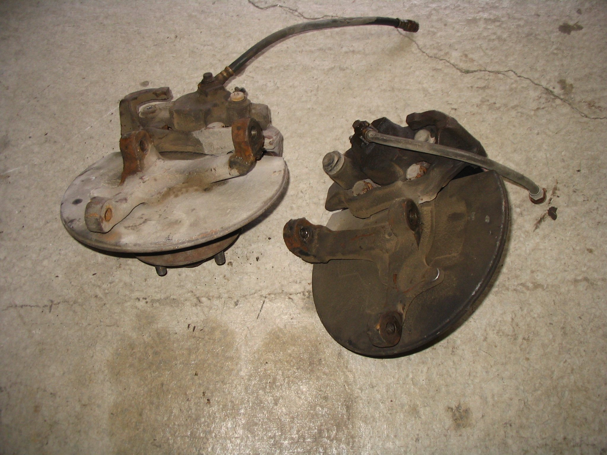 I pulled front spindle/brake disc assemblies from '86 Chevette. $50 for the pair from Bucks. As I understand it the spindle /brake caliper can be used with a Nissan 210 brake rotor and a Datsun B210 seal to give me the same bolt pattern as the Toyota diff. I'll be using Datsun 280ZX wheels until I can locate a set of suitable Minilites or Revolutions. The calipers will need rebuilding, or replacement, but will do for fabrication purposes.