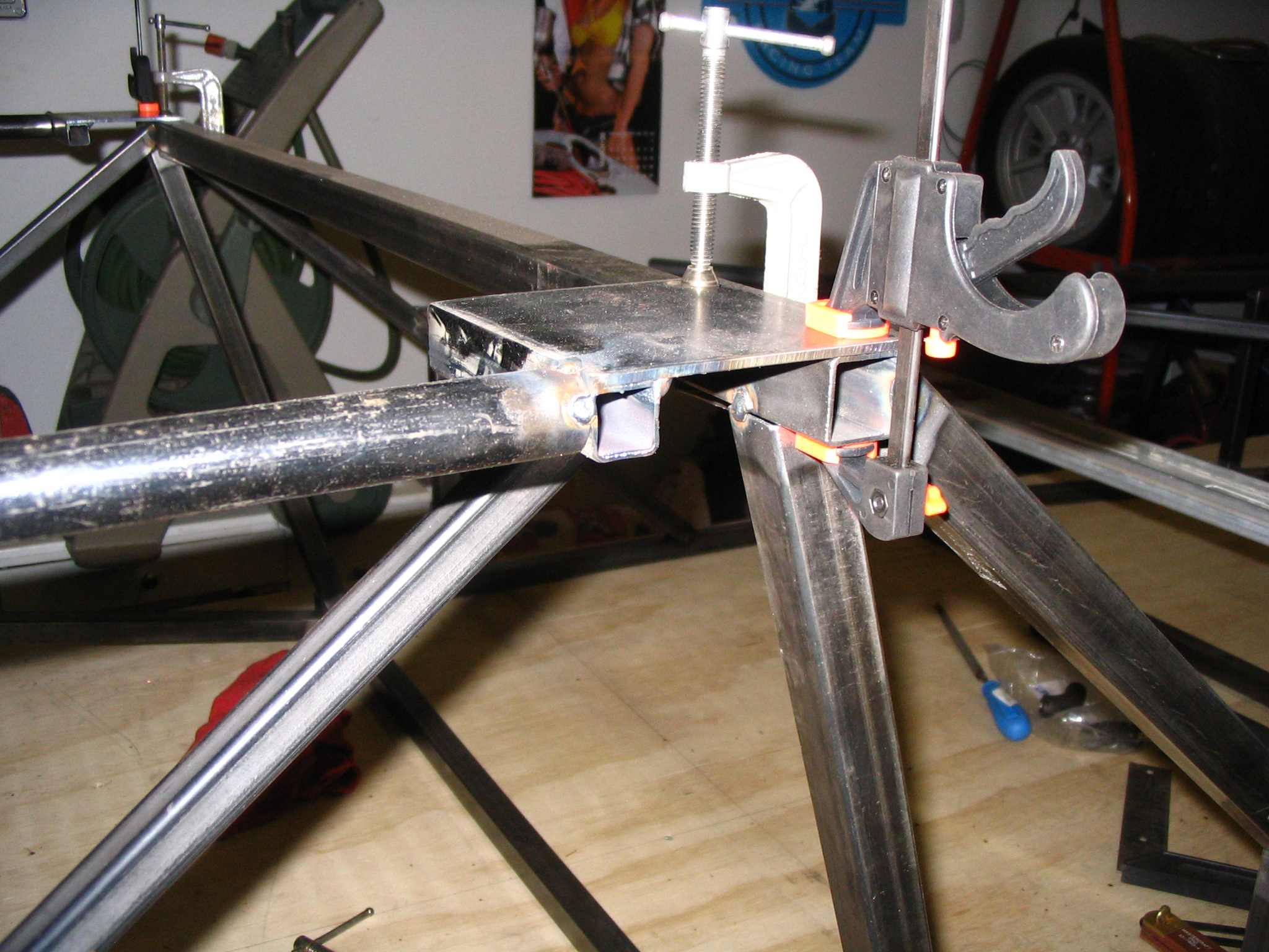 After much floundering at the work table, I decided to make the top bar into a sub-assembly consisting of the top bar tack welded to the 4" square plate and the 4" long, 3/4" square tubing. Once I had the sub-assembly together it was clamped in place. I have two framing squares clamped at the back of the main tube. They are just supporting the main tube until I get the back support tubes in place (X3 and X4). I don't have the 4" square plate tacked onto the main chassis yet.